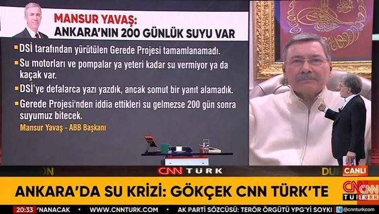 Melih Gökçek, Mansur Yavaş’ın ‘Ankara’nın 200 günlük suyu var’ tezlerine CNN Türk’te karşılık veriyor. Melih Gökçek kelam konusu krizin sebebi olarak Mansur Yavaş ve takımının yetersizliğini gösterdi.