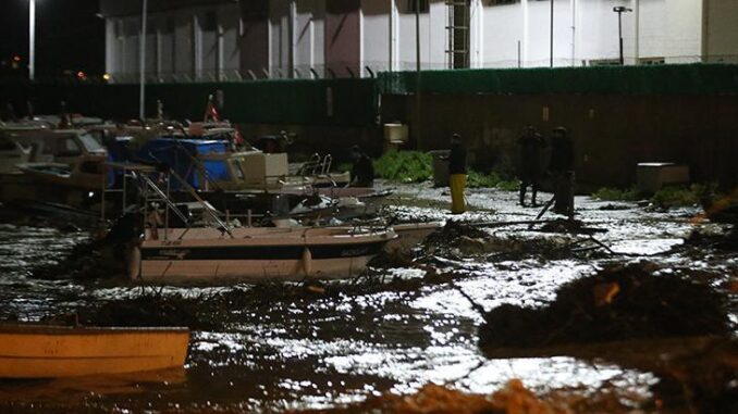 Güçlü su akışıyla taşan çay, balıkçı barınağına yanlışsız ilerledi. Burada bulunan kimi tekneler taşkından ziyan görürken mal sahipleri teknelerinin halatlarını güçlendirdi.