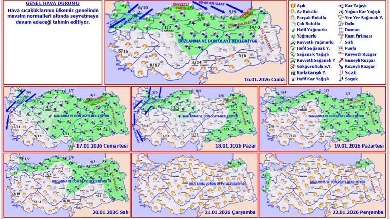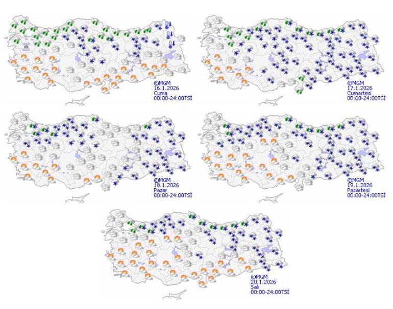 Raporda, en düşük ve en yüksek hava sıcaklıklarının, modüllü ve az bulutlu hava beklenen yarın 8/12, kesimli bulutlu hava iddia edilen 16 Ocak Cuma günü 6/12, kesimli bulutlu ve hafif yağmurlu hava öngörülen 17 Ocak Cumartesi günü 3/7 derece olacağı kaydedildi.